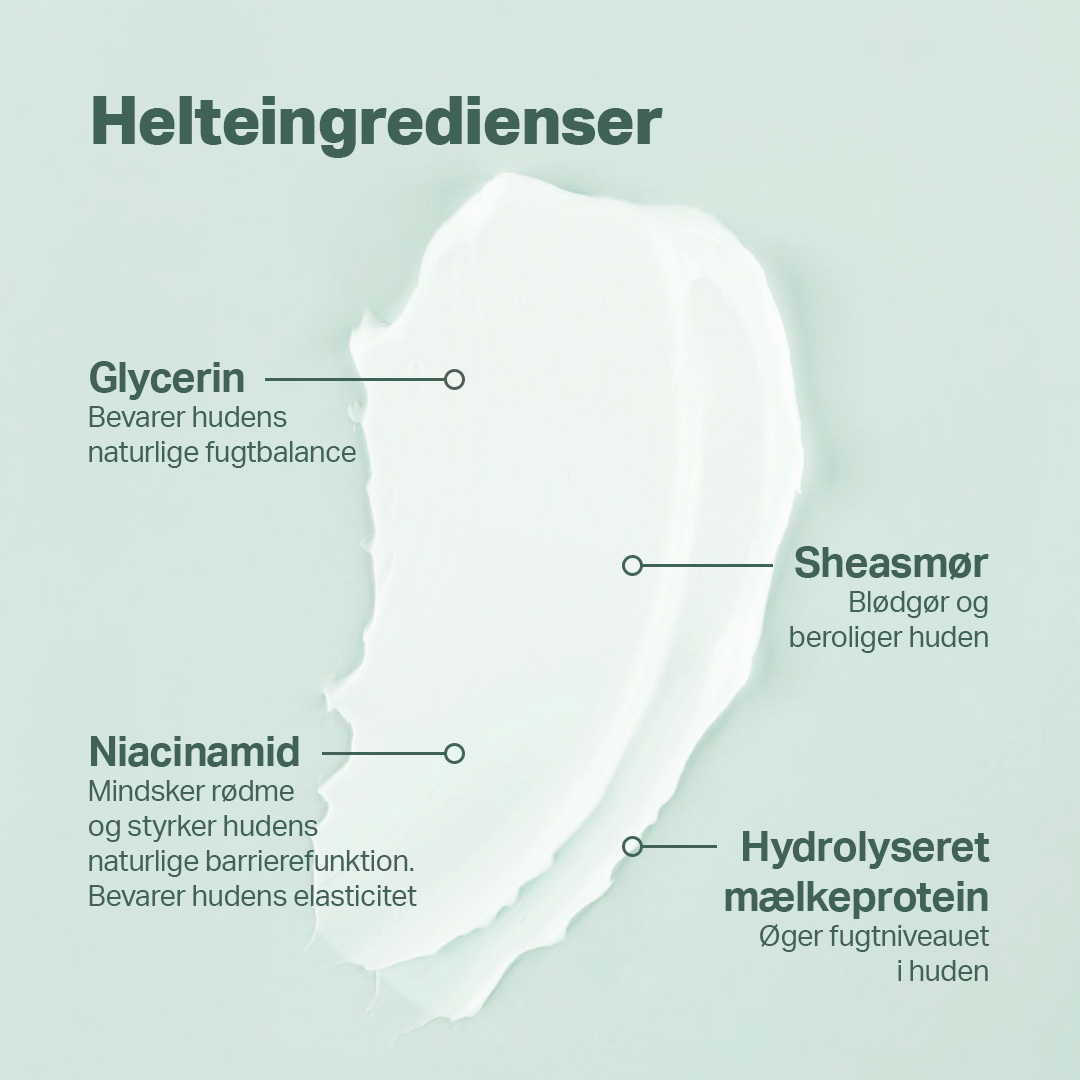 Cremen har en rig og blød konsistens, der bl.a. skyldes det høje indhold af sheasmør, som giver fugt og har en beroligende virkning på tør hud. Indholder også 3% niacinamid, der reducerer rødme og irritation.